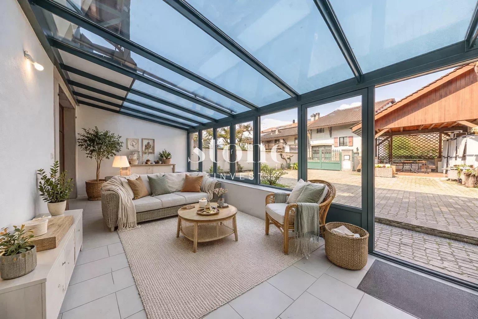 L’extérieur, dont l'accès se fait par un portail, est agrémenté par une charmante cour pavée à l'abri des regards, d’un couvert et de plusieurs places de parking.