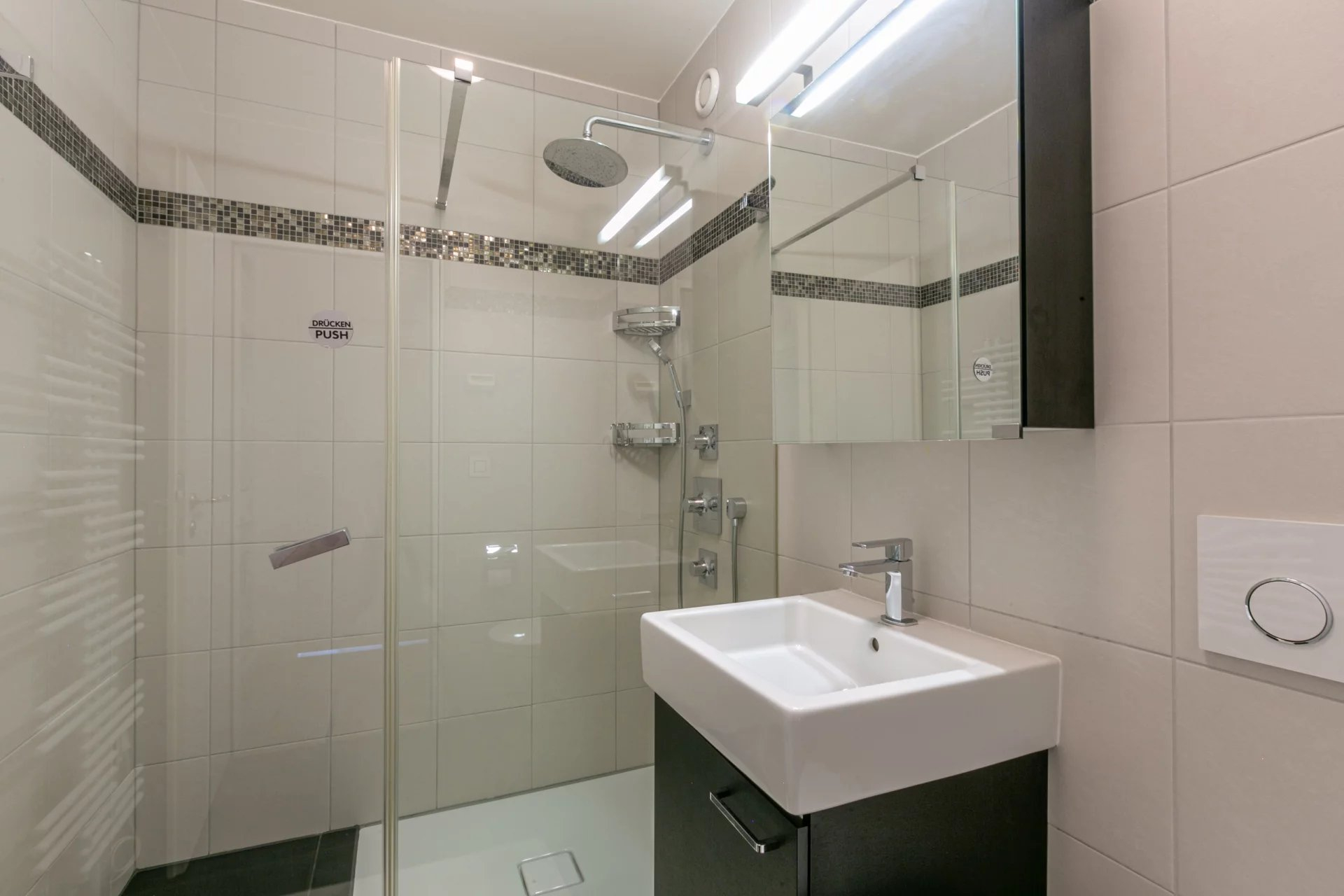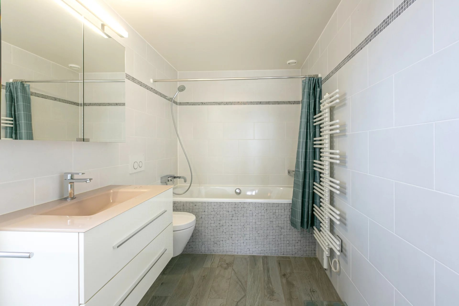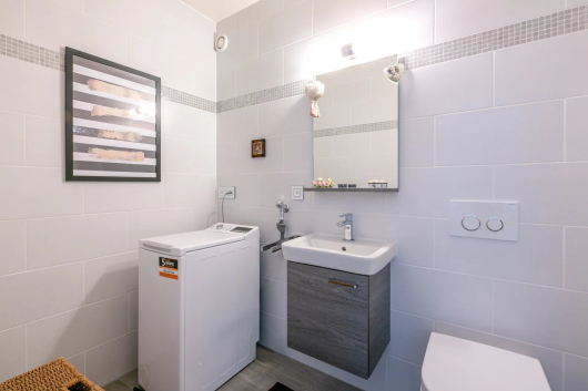 Spacieux hall d’entrée donnant sur le salon/salle à manger et cuisine semi ouverte. Cet espace de vie donne accès à une très belle terrasse, un grand WC visiteurs avec lavabo, 3 chambres à coucher dont une master bedroom avec salle de bains attenante, une très belle salle de douche avec lavabo et WC est commune aux deux autres chambres.
