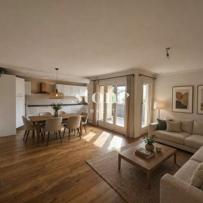 L'agréable pièce de vie s'ouvre sur la terrasse et sur le superbe jardin, très joliment arboré et entièrement clôturé, profitant d'une belle vue dégagée.