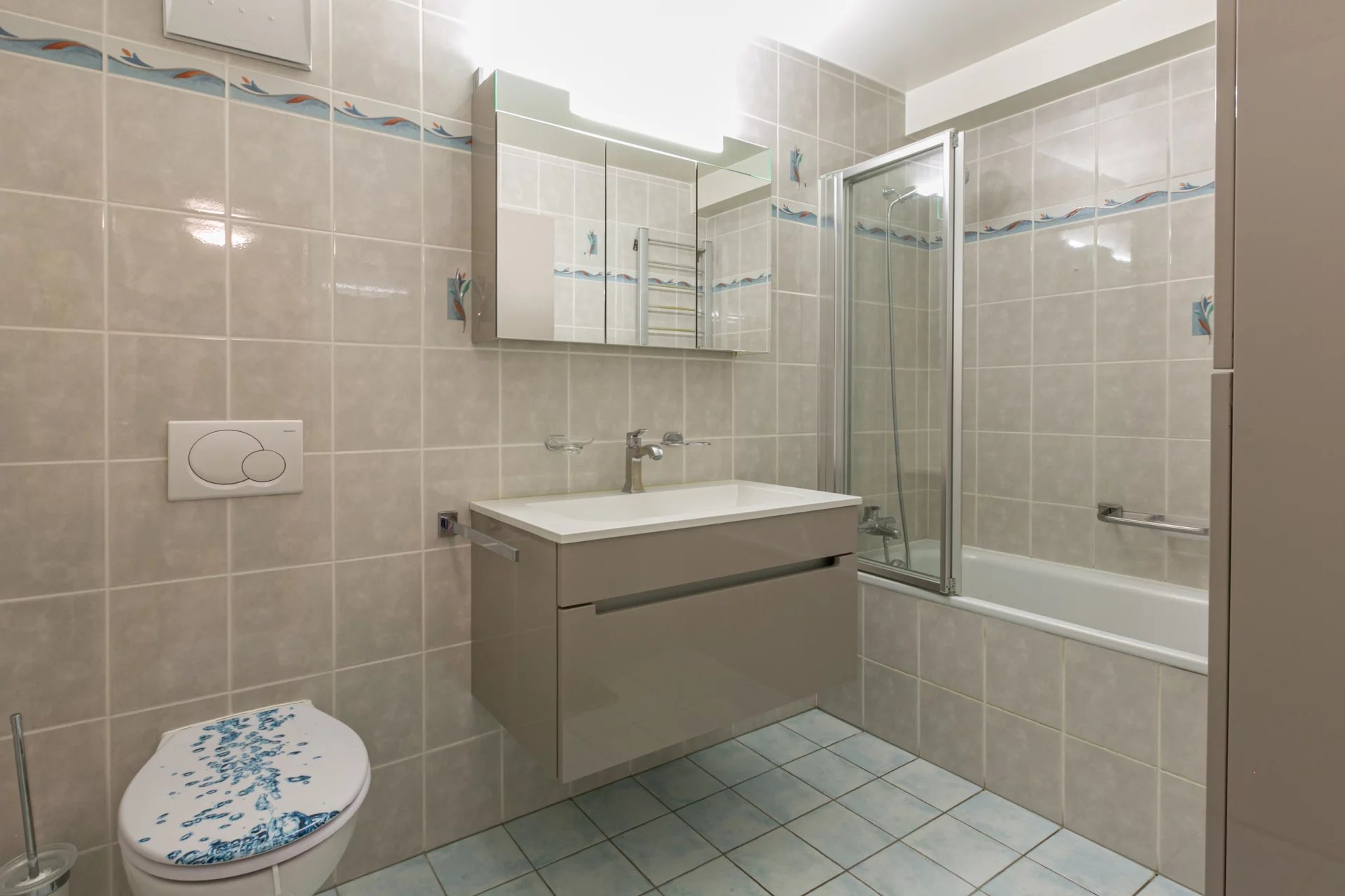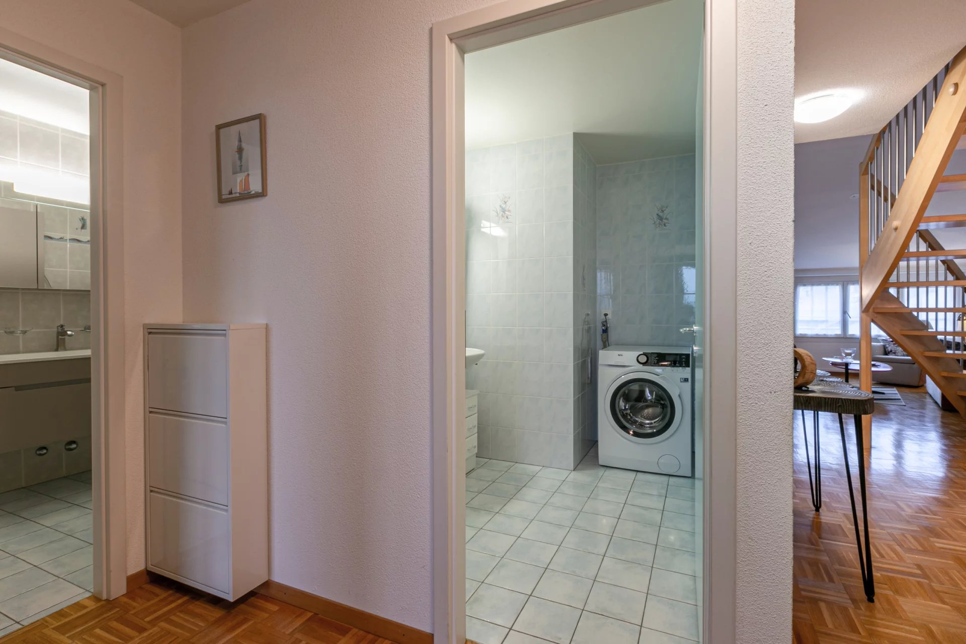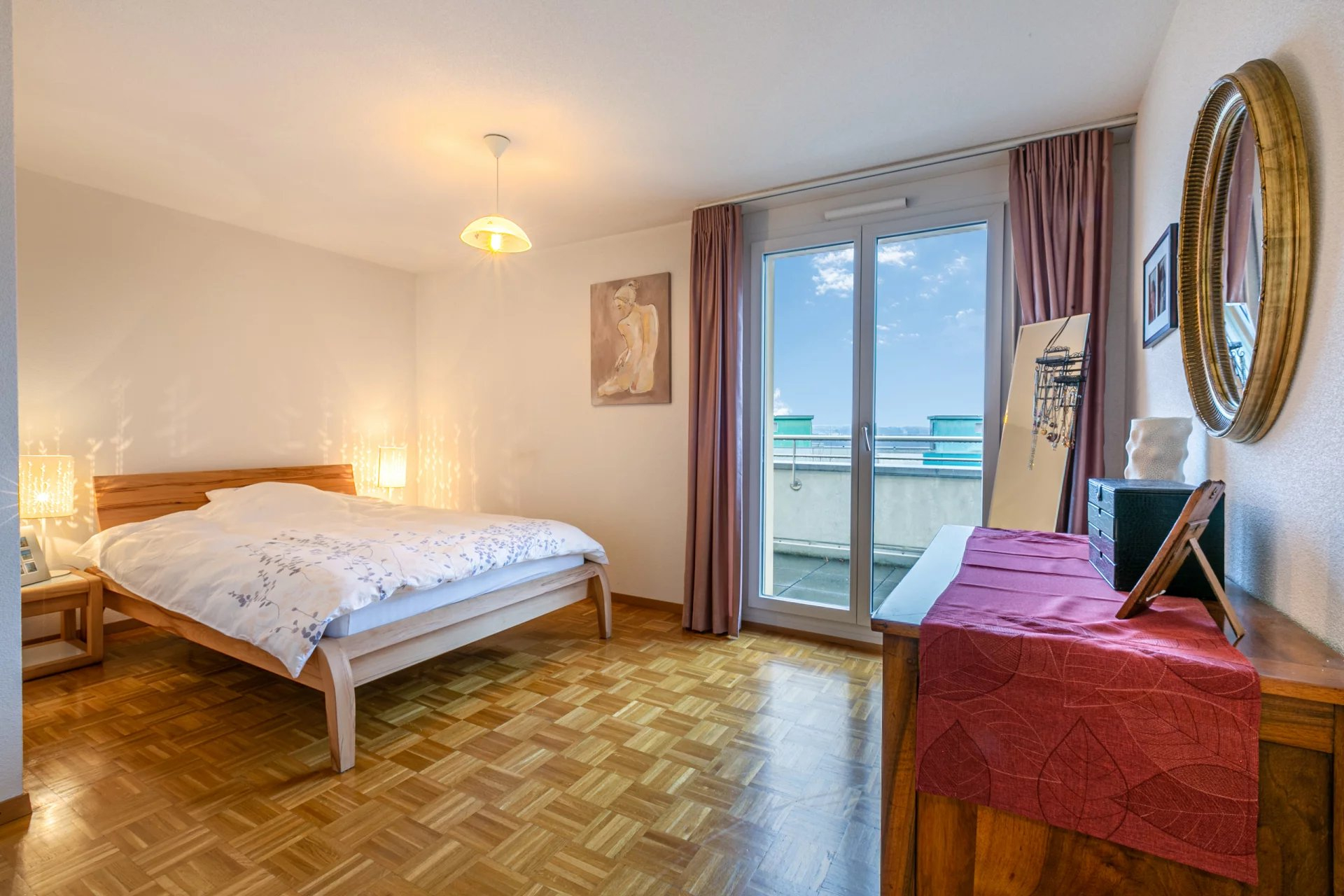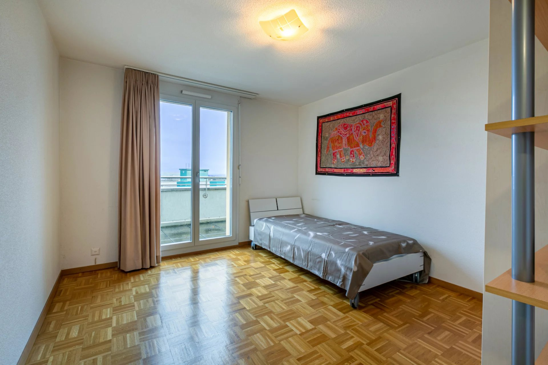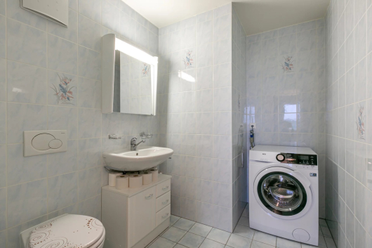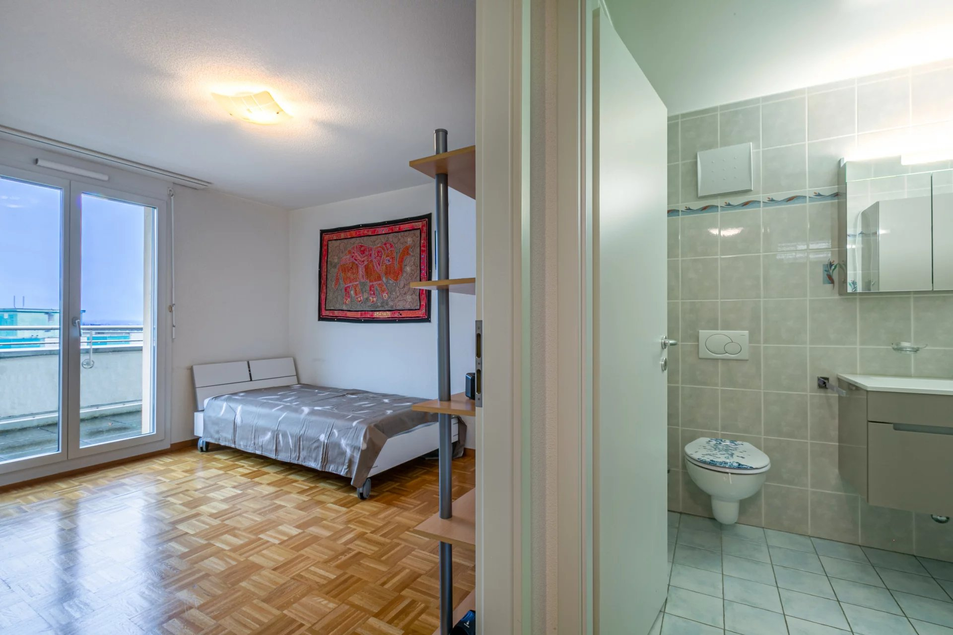 Coté nuit: 2 spacieuses chambres, les deux avec accès au balcon avec vue sur le Jura, une salle de bains avec baignoire et un wc visiteurs avec lavabo et avec espace pour la colonne de lavage.