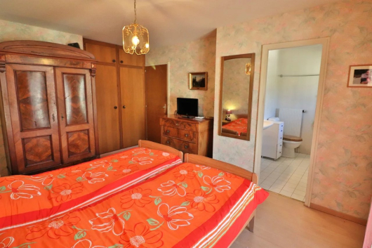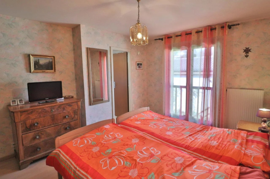 A l'étage se trouvent la chambre parentale avec salle de bains en suite avec fenêtre, une 2ème spacieuse chambre, à l'origine séparée en 2, une salle de bains avec douche et WC.