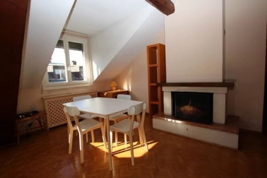 Bel appartement en mansarde au 5ème étage d'un immeuble sis aux Eaux-Vives Spacieux hall d'entrée, living avec cheminée, cuisine ouverte sur le living, 2 chambres à coucher dont une grande et une plus petite, une salle de bains et un WC. L'appartement est loué meublé CHF 3.500.-- par mois en ce moment...