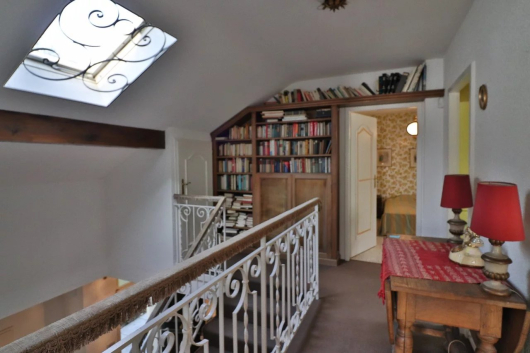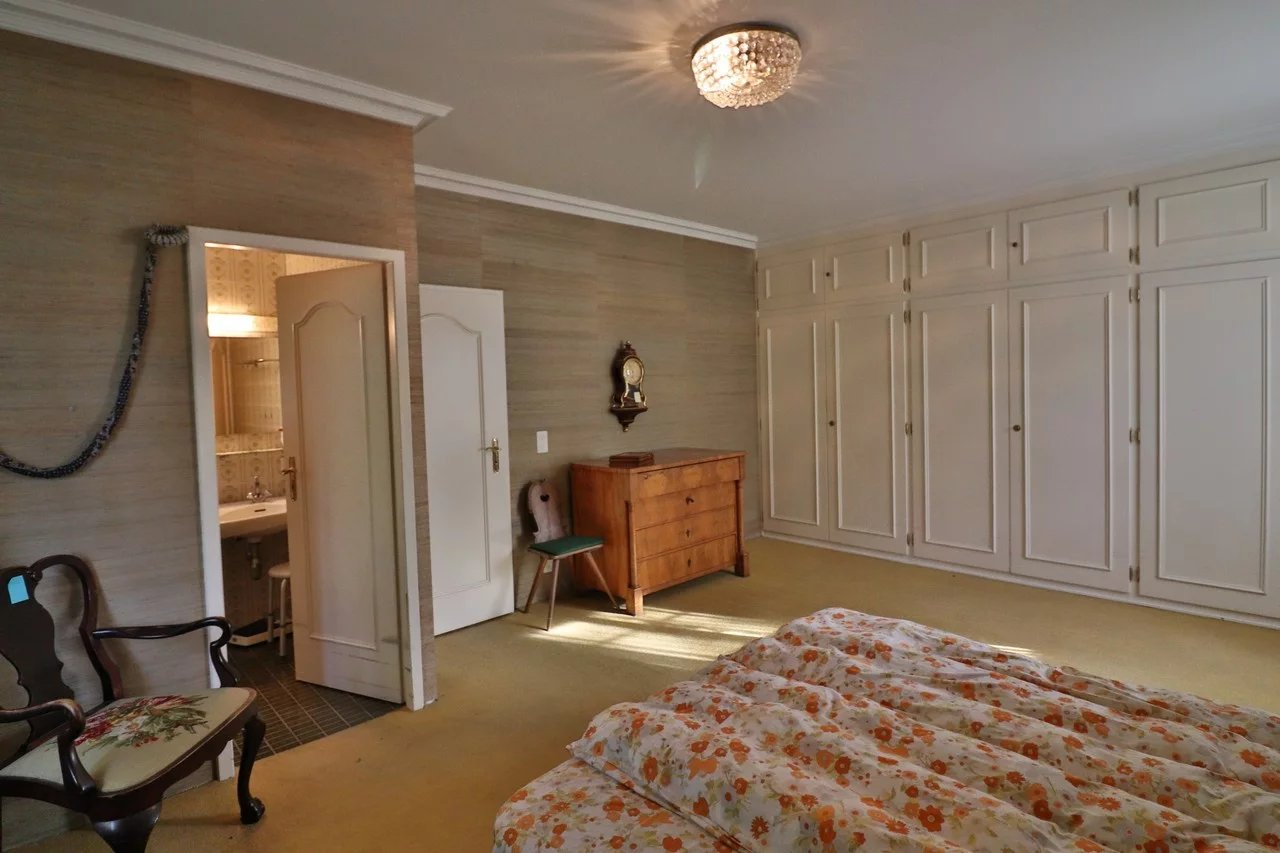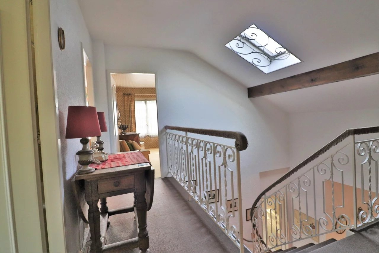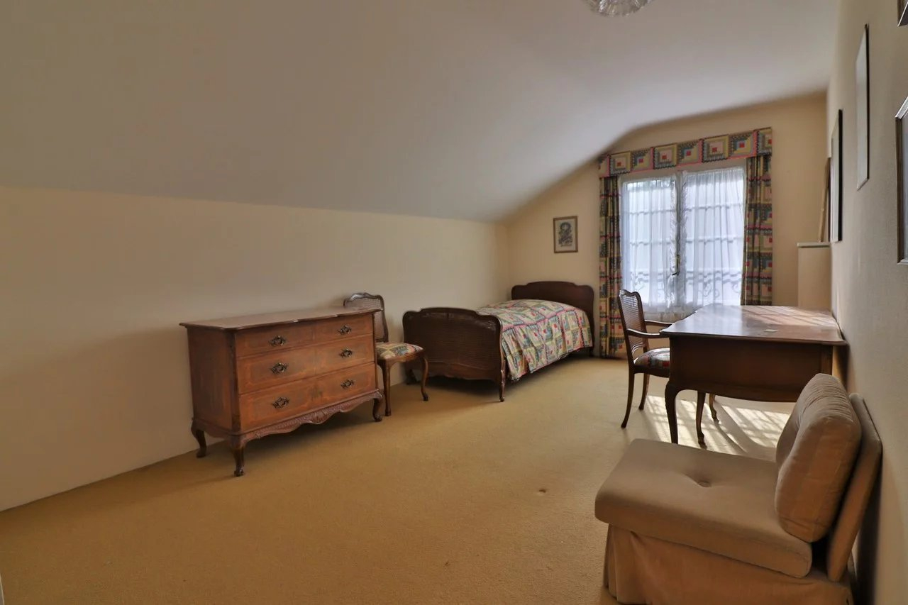 A l'étage : 3 généreuses chambres, 1 salle de bains avec veloux. La pente sous les toits est utilisée comme galetas. Au sous-sol: une grande cave, le local technique, une buanderie et le garage pour 2 voitures avec porte automatique.