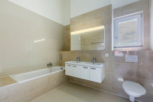 Erigée sur 86m2 au sol, la maison offre, au rez, un superbe espace salon-salle à manger ouvert sur la cuisine entièrement aménagée avec des grandes baies vitrées donnant accès à la terrasse et au jardin clôturé offrant une belle intimité. Ce niveau est complété par un wc visiteurs avec lavabo. L'entrée avec armoire dessert l'étage et le sous-sol.
