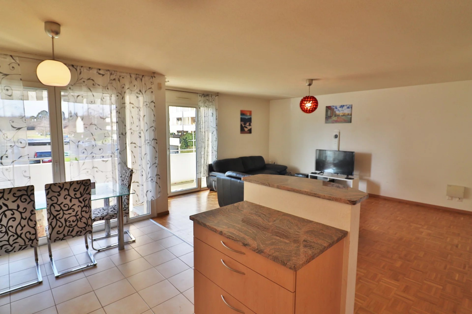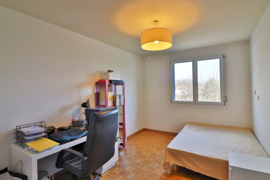 Venez visiter sans tarder ce lumineux 4 pièces traversant, de 91m2, situé dans un petit immeuble de 3 niveaux avec ascenseur. Il profite d'un environnement verdoyant proche de l'ONU, de l'aéroport ainsi que de l’autoroute et du lac. Il profite d'une superbe luminosité, de chauffage au sol et de doubles vitrages.