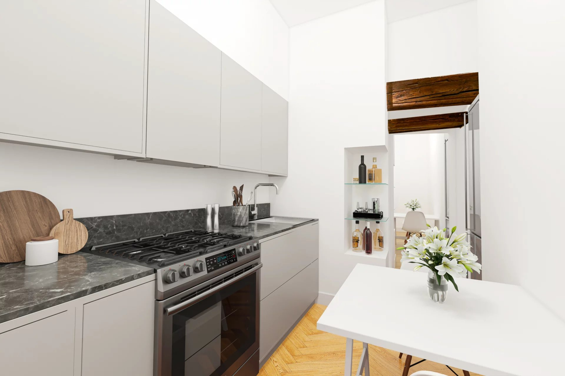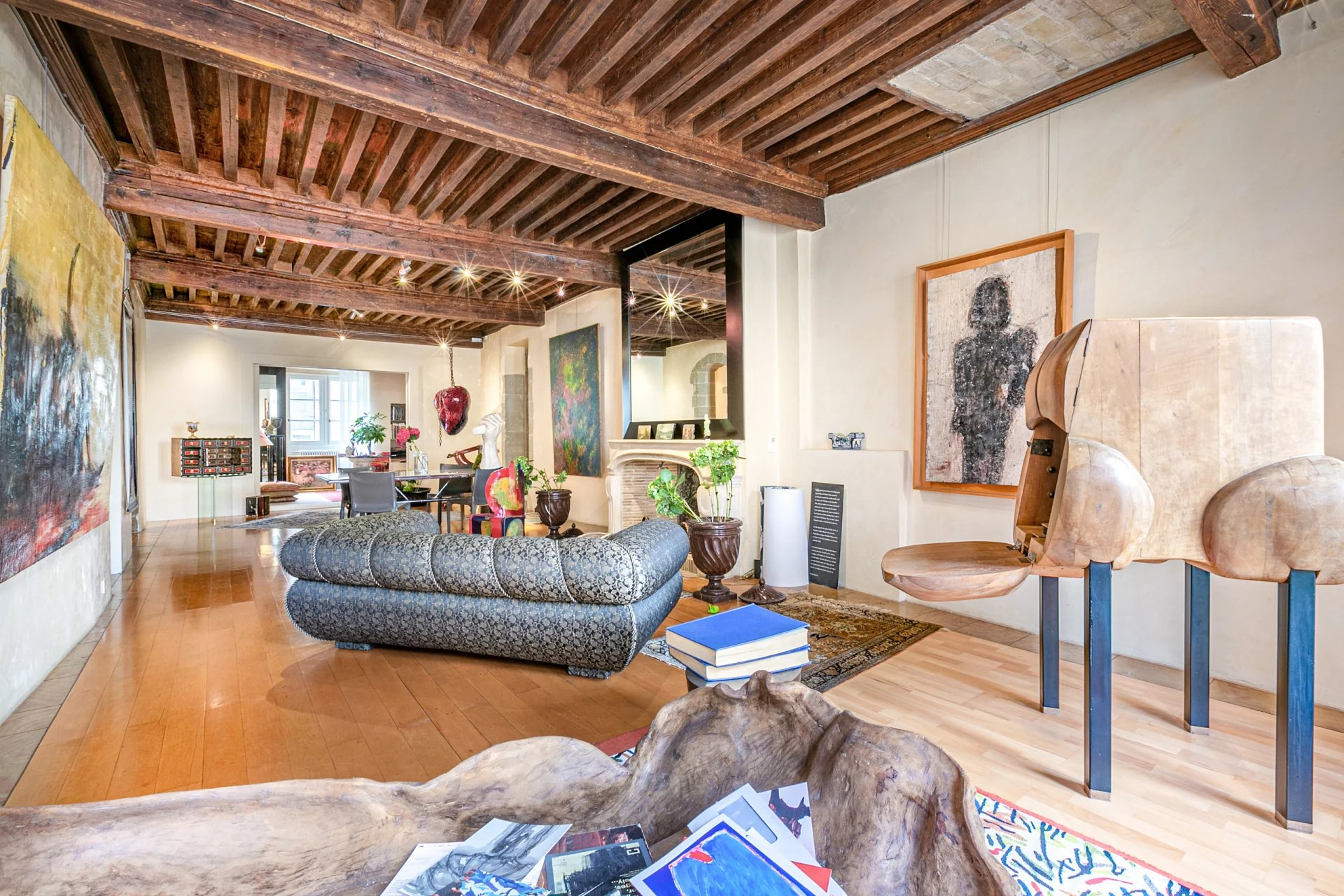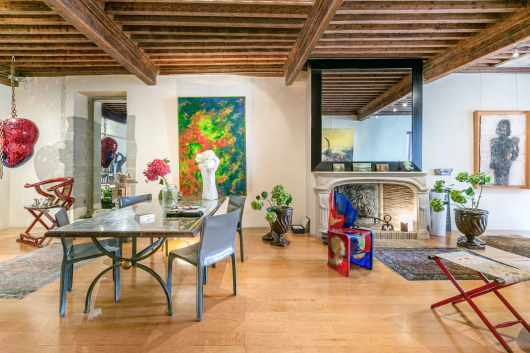 Un ascenseur privatif vous introduit directement dans l'appartement qui occupe l'entier du 2ème étage. Il se compose d'un spacieux hall aménagé en bureau ainsi que d'une buanderie pour la partie jour. Une cuisine équipée donnant un accès au séjour et accessible depuis le hall d'entrée. Vous trouverez une spacieuse pièce de vie, baignée par la lumière, avec poutres apparentes et hauts plafonds, agrémentée par une cheminée Louis XIV (acheté chez le plus grand antiquaire de France au Faubourg-Saint Honoré à Paris).
