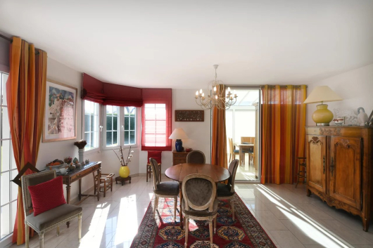 1 hall d’entrée, 1 wc visiteurs, 1 cuisine équipée, 1 grand séjour/salle à manger avec cheminée, 4 salon TV, 1 bureau, 1 véranda.
