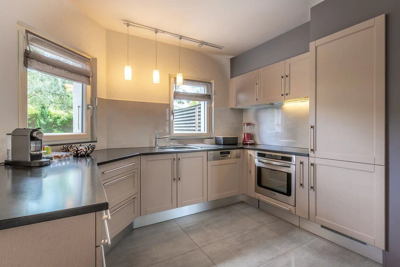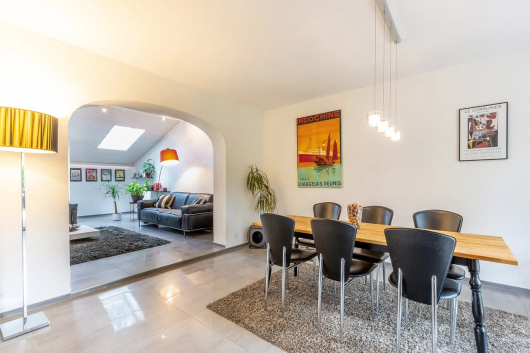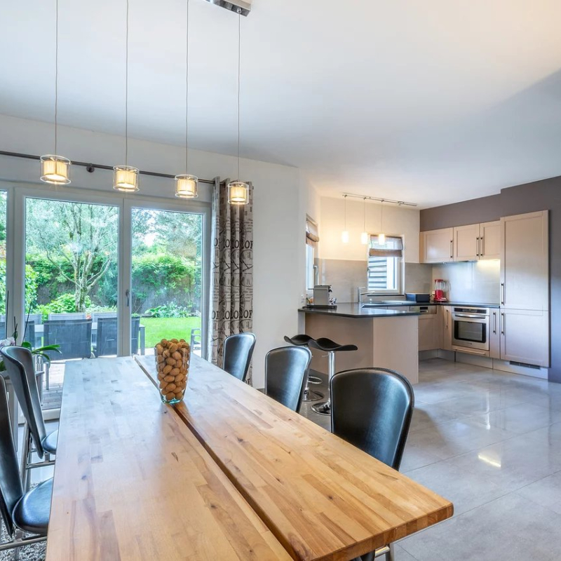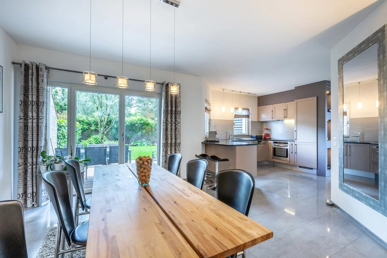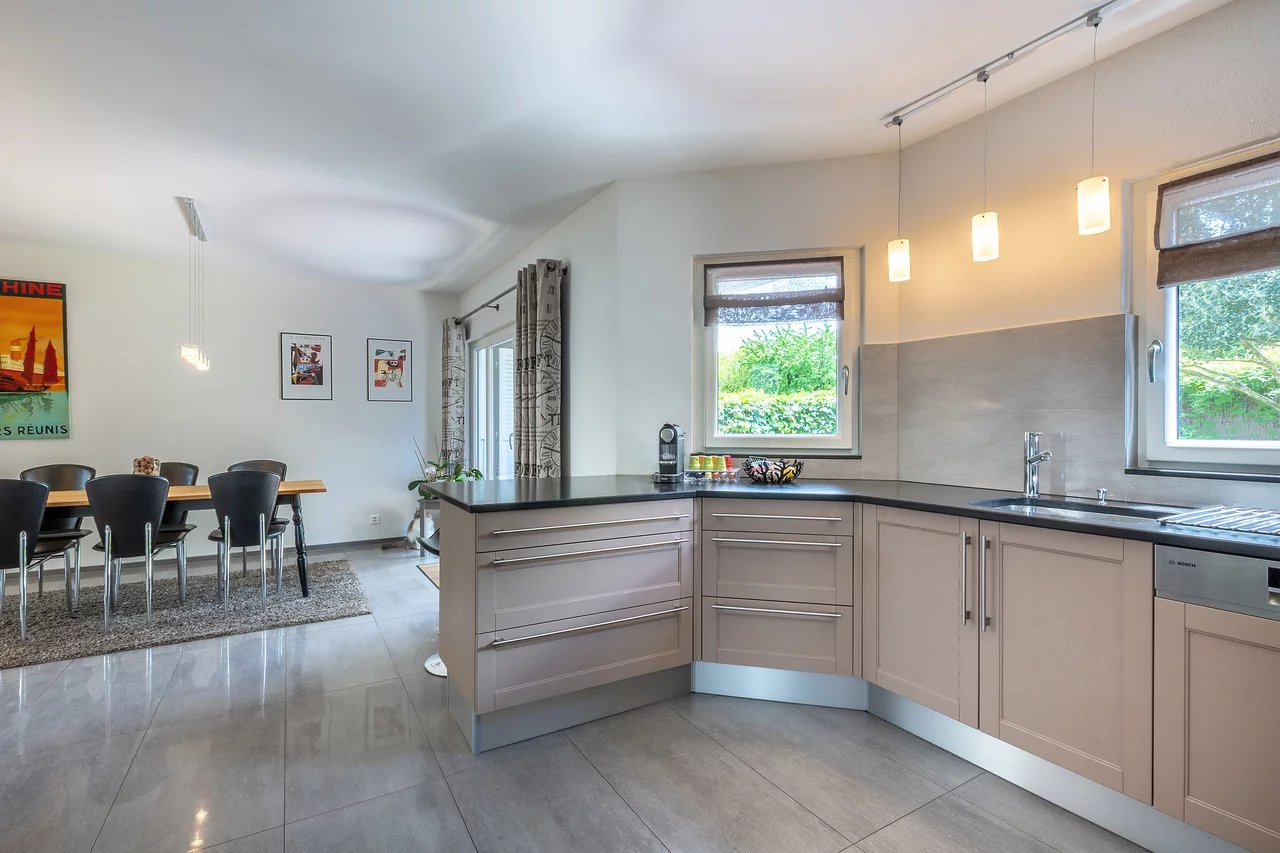 La cuisine, entièrement équipée, avec un plan de travail en granit, est ouverte sur la salle à manger et le salon, profitant d'une très belle hauteur sous plafond.
