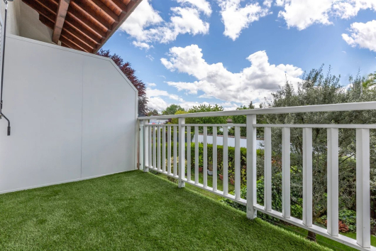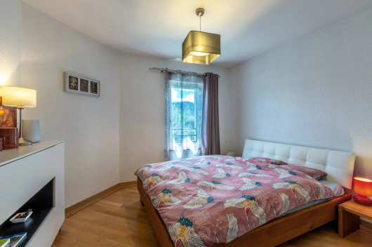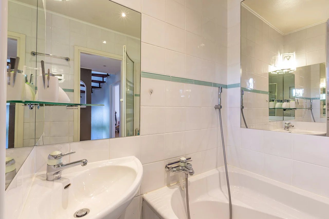 A l'étage: 2 chambres, la plus petite profite d'un balcon qui donne sur le jardin et serait idéale comme bureau ou pour un petit enfant. Une salle de bains avec baignoire et fenêtre.