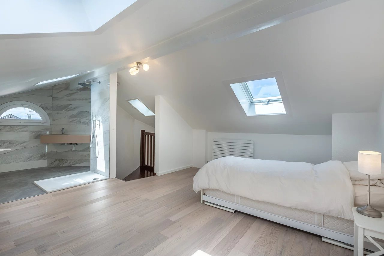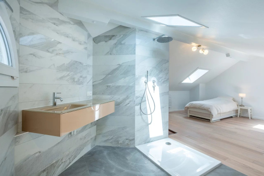 Sous les combles, une spacieuse chambre parentale ouverte sur une salle de bains privative avec douche à l'italienne.