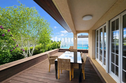Du salon on accède à la terrasse qui entoure les pièces de vie et donne accès au spa jacuzzi.