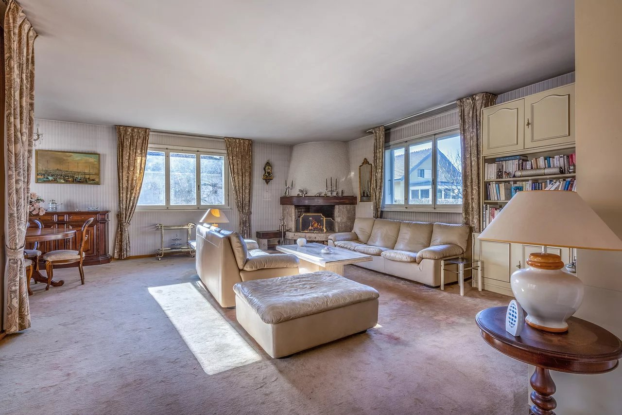 Excellente situation et grand potentiel d'aménagement. Villa individuelle de plain-pied plus sous-sol. Sise sur une parcelle d’environ 1350 m2 située dans un quartier résidentiel, au calme et verdoyant. Elle se compose de 6 pièces : Salon avec cheminée, salle à manger s'ouvrant sur une terrasse donnant...