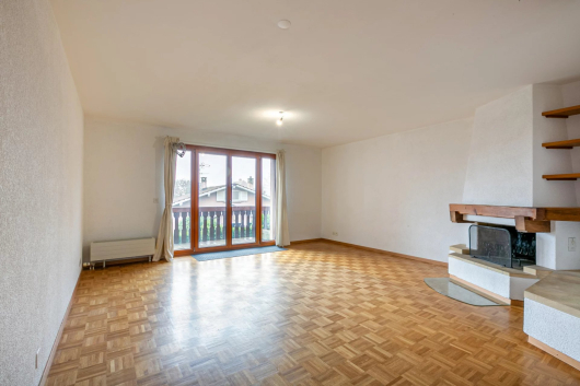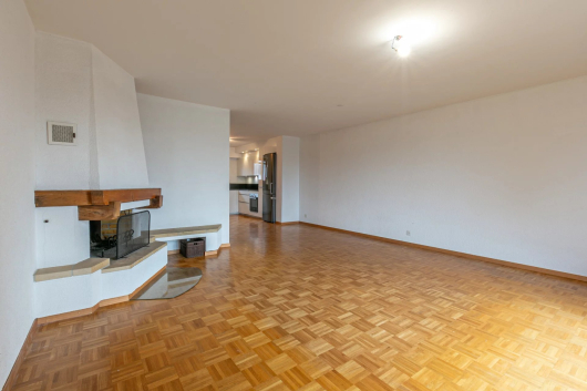 A spacious living room with fireplace facing south-west opens onto the balcony of 7m2 with a clear view. The open kitchen is fully fitted and equipped. A bathroom with shower and window and storage space complete this level.