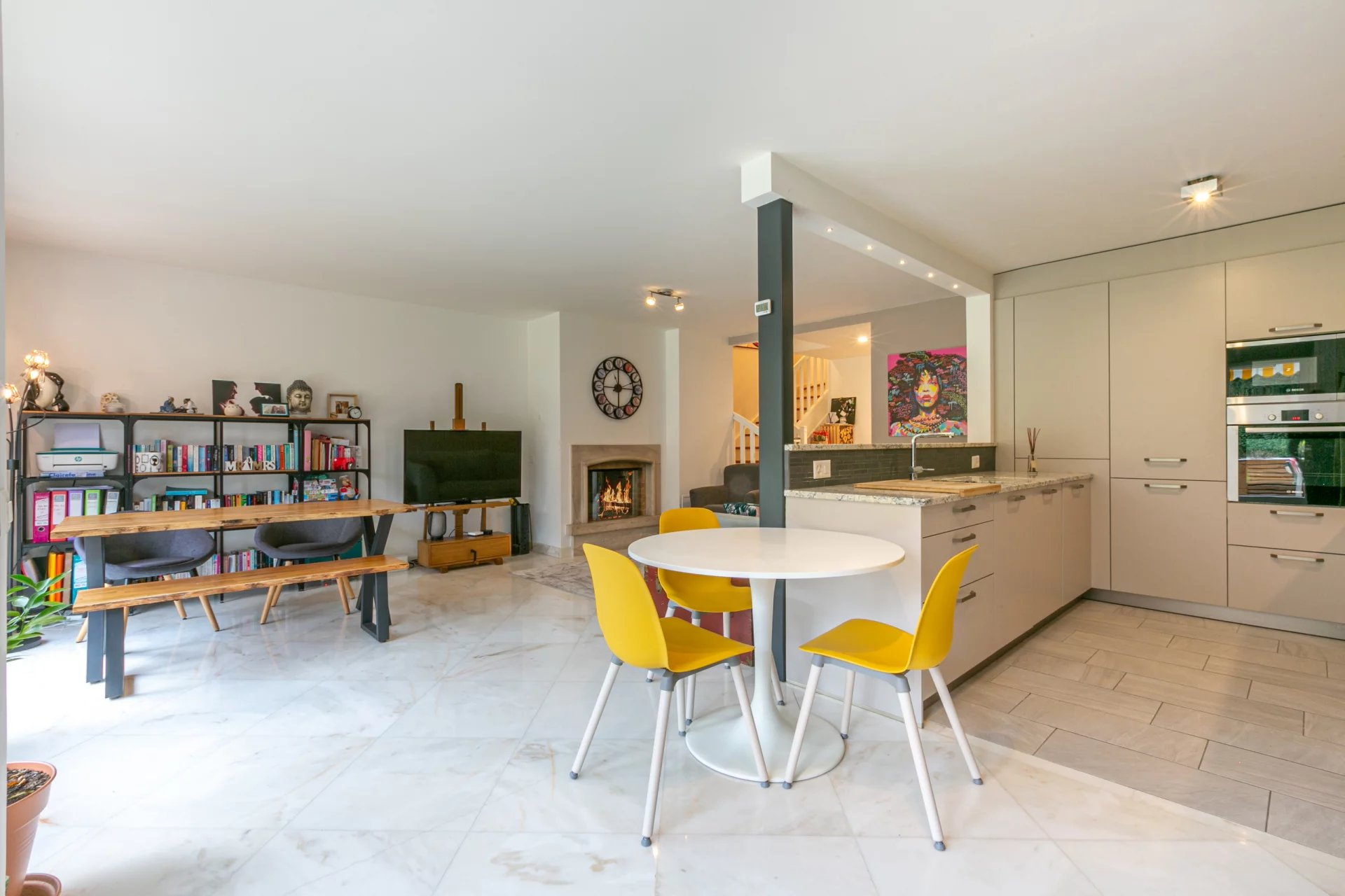 - On the ground floor you will find a modern fully equipped kitchen opening onto a large bright living and dining room with fireplace overlooking a south, south-west facing terrace in a green and quiet setting. A master suite with its dressing room and private shower room also overlooking the green countryside.
