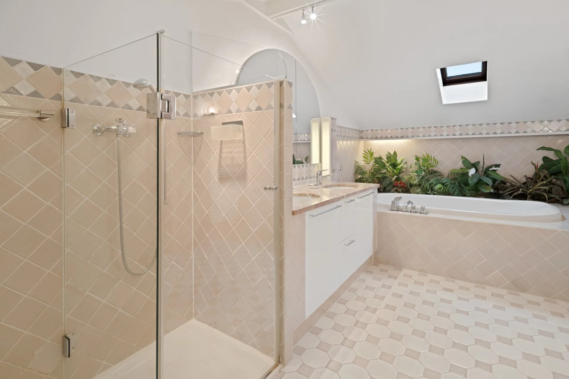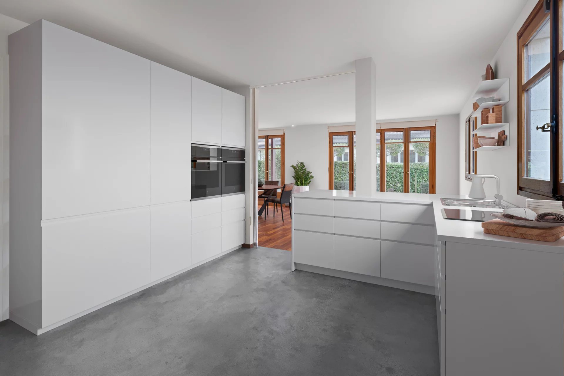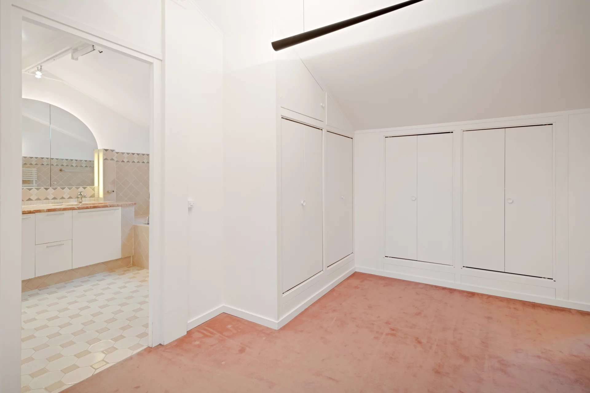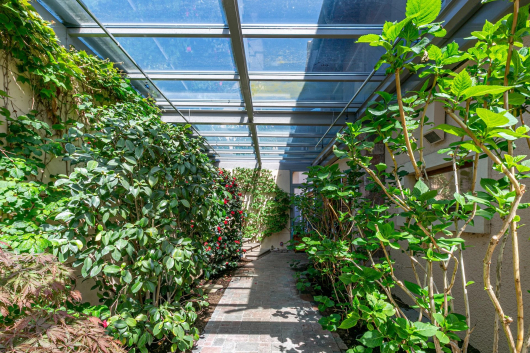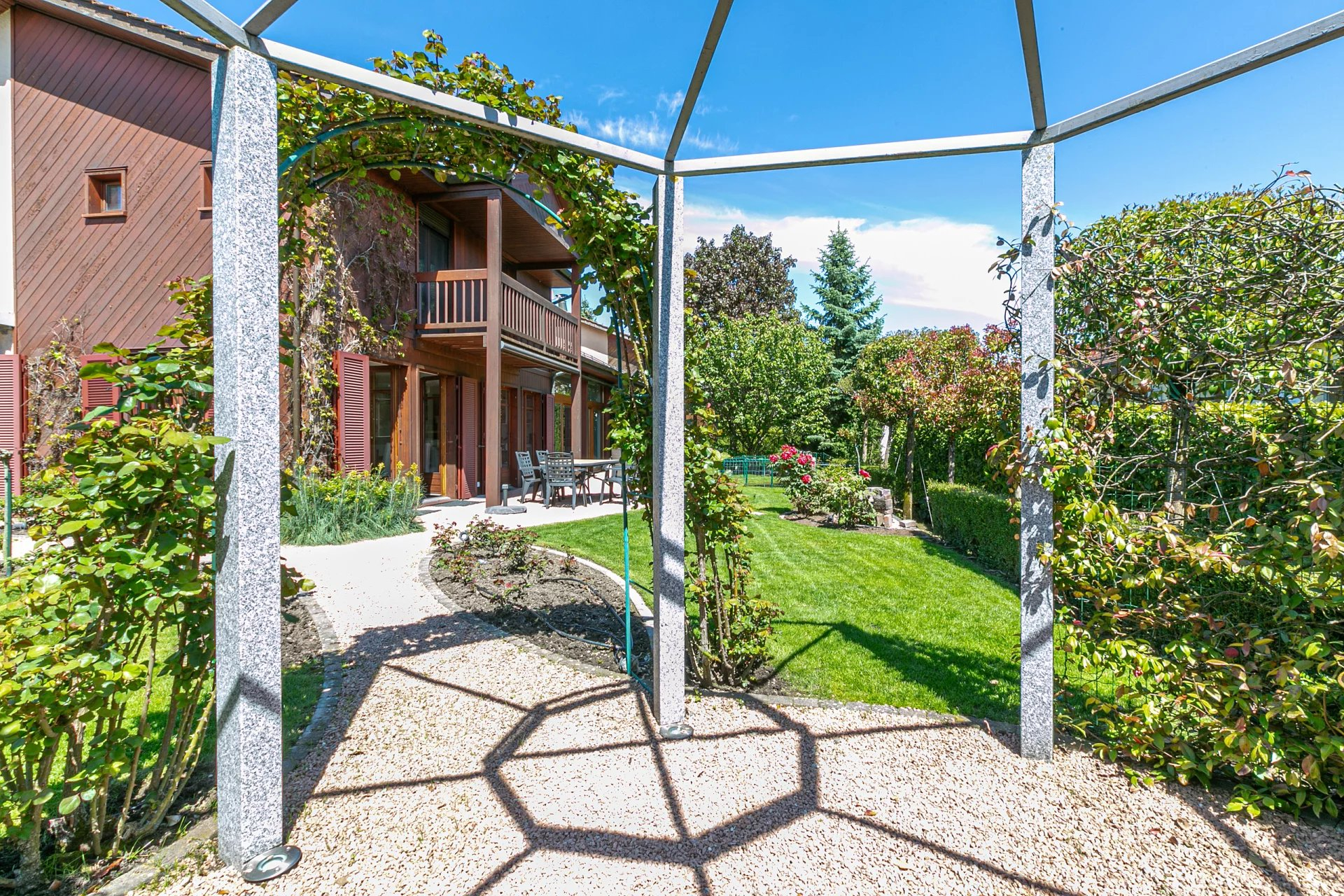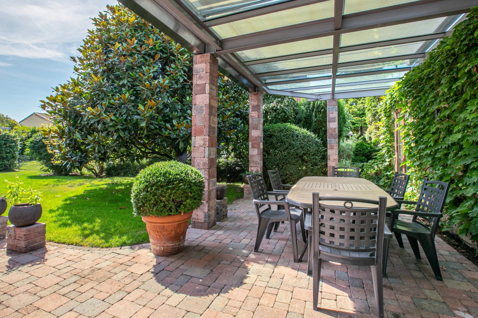 The living rooms have access to the covered terrace and the garden and on the kitchen side, on the extension of the entrance greenhouse, a superb space protected by the pergola with automatic blinds.