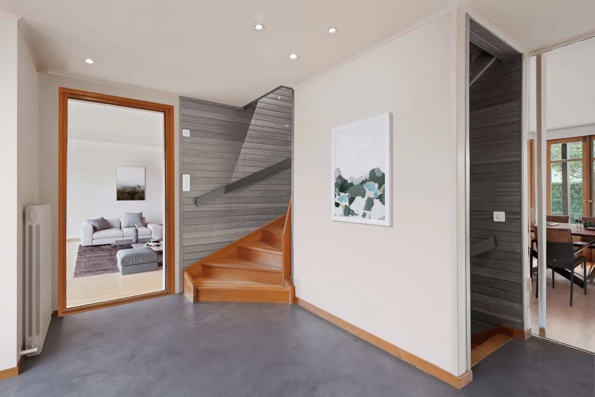 The basement is completely excavated and contains a laundry room, the technical room, the cellar, a spacious room with skylight windows and a lot of storage space.