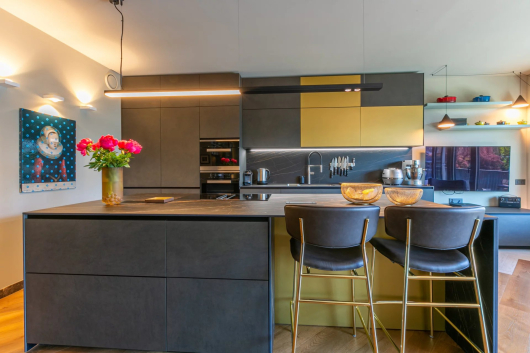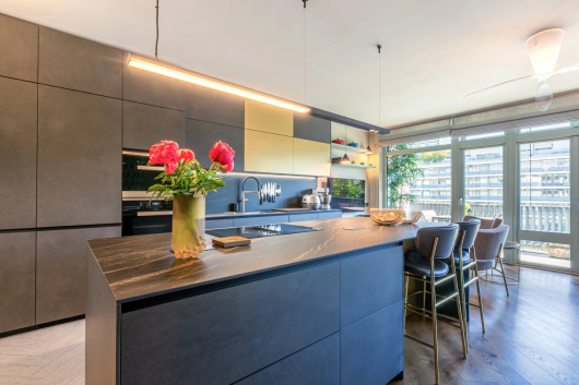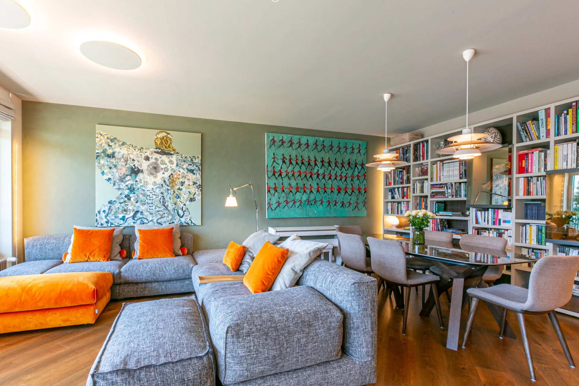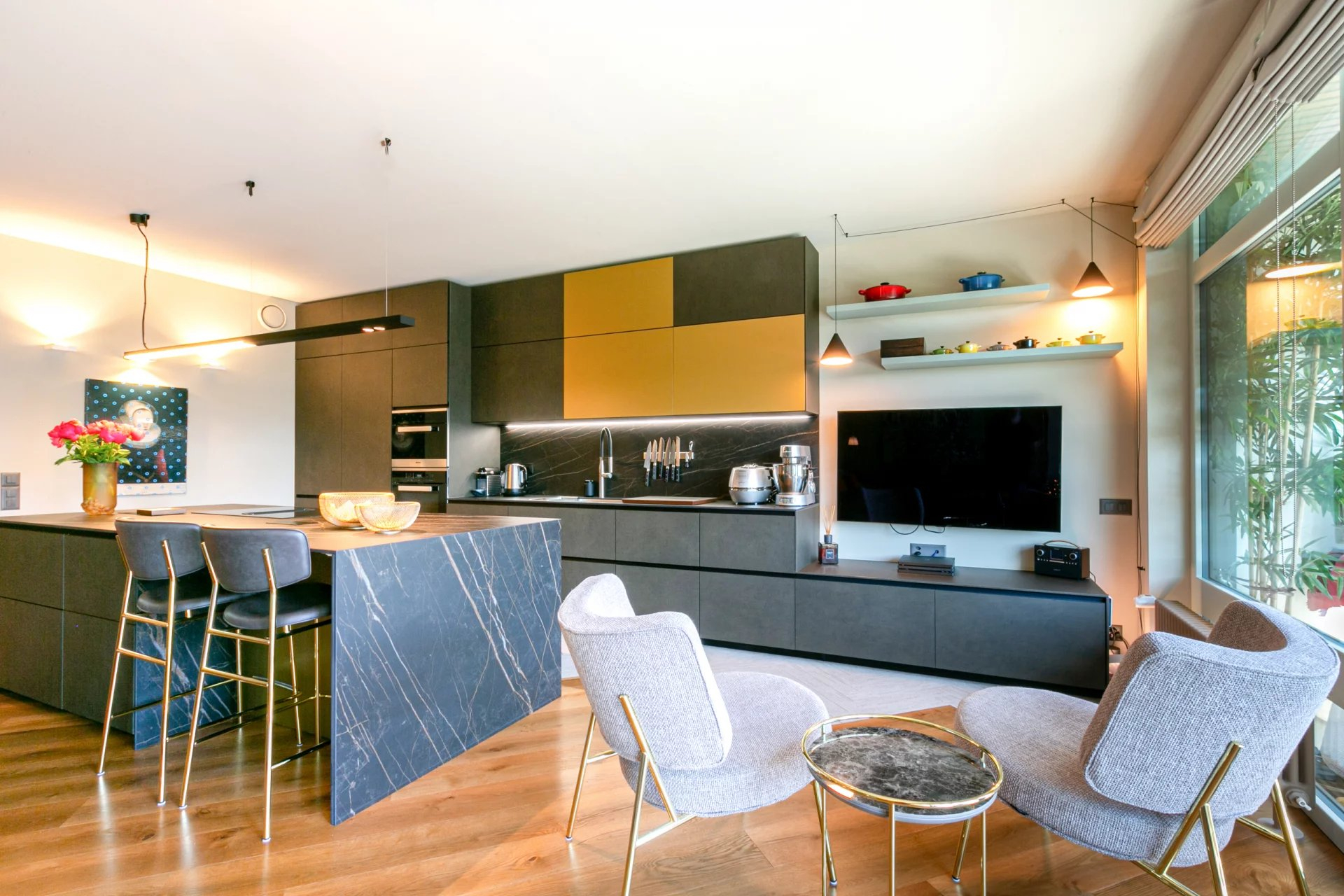 The living area features a bright living room with parquet flooring, opening onto a fully-equipped kitchen with top-quality appliances and materials. The spacious living area has access to a south-facing balcony with uninterrupted views.