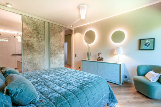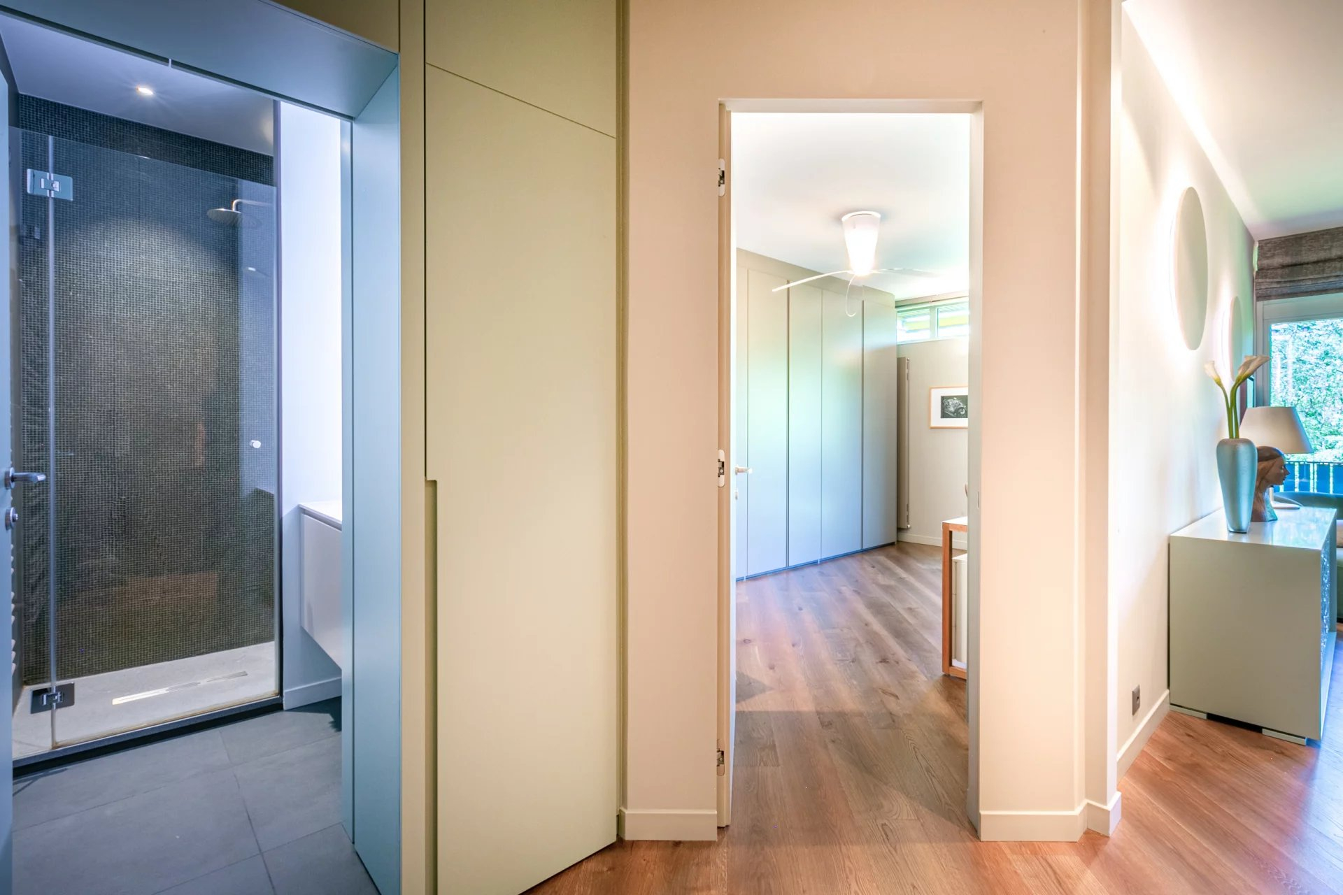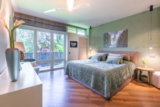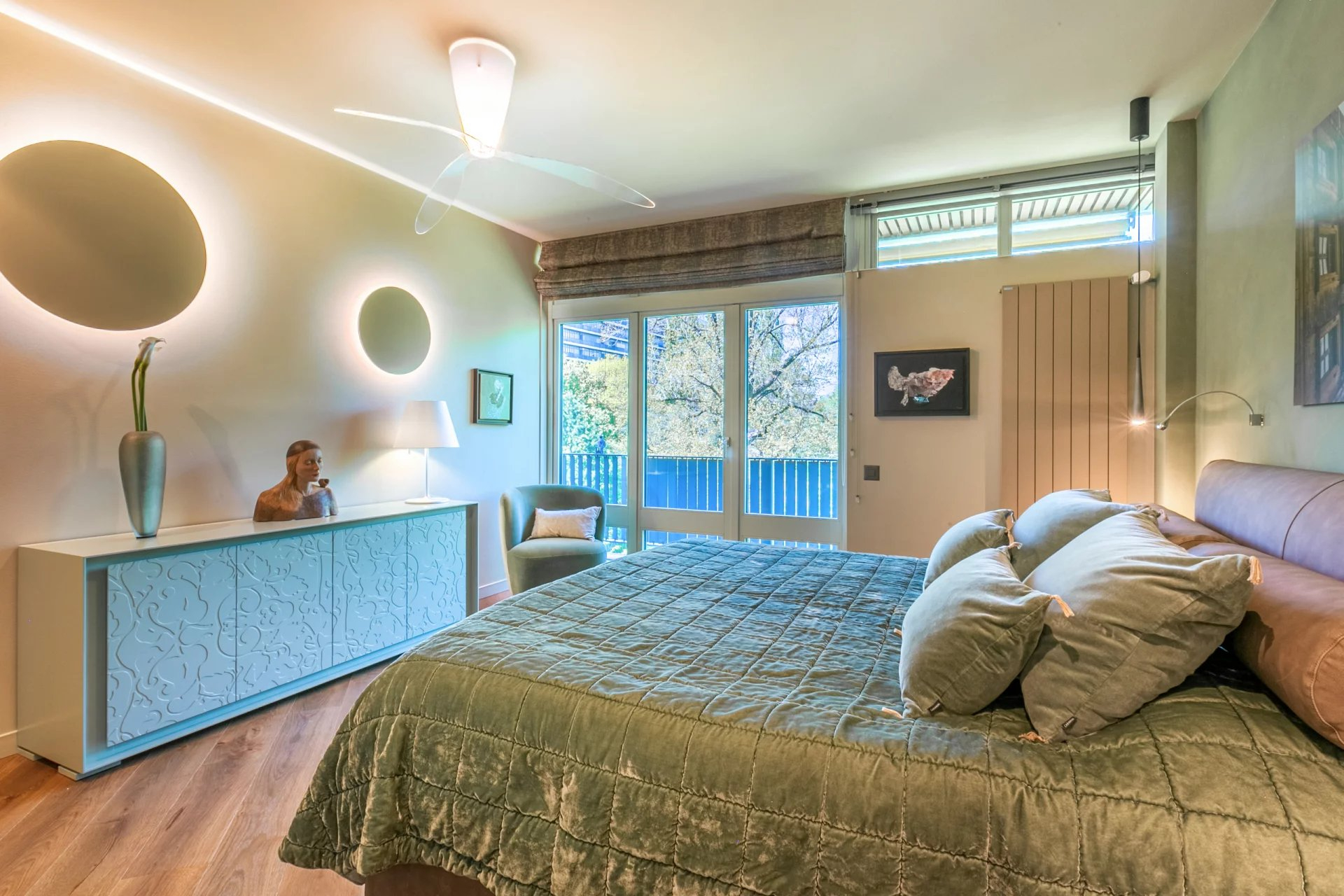 The night area boasts a large master bedroom with en suite bathroom, opening onto a second balcony with a beautiful view of the trees in a peaceful setting.
